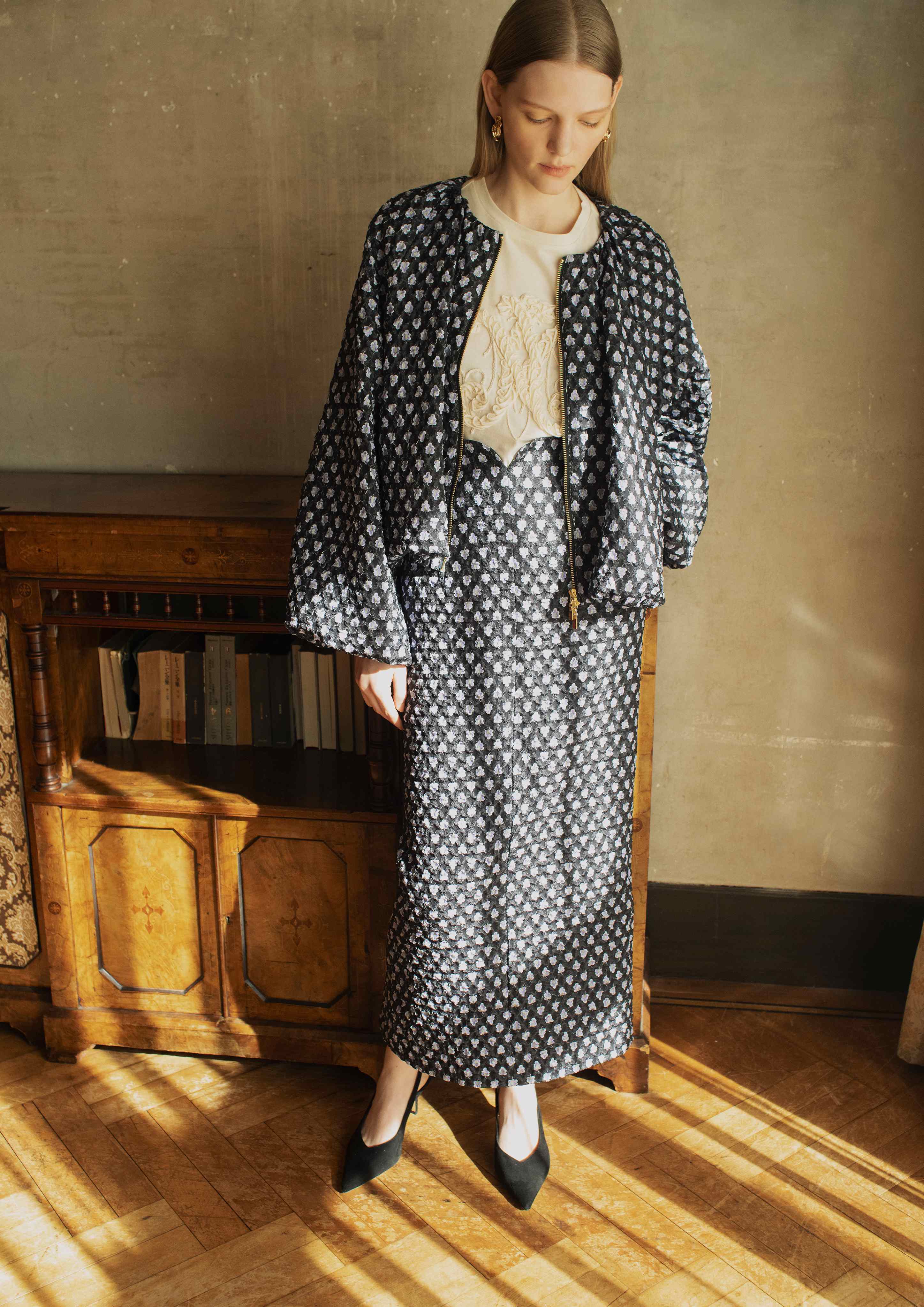 意匠感のある幾何柄のフクレジャカードにさらに転写プリントを施し新たな表情を出したオリジナル素材は伸縮性があり着心地も抜群。