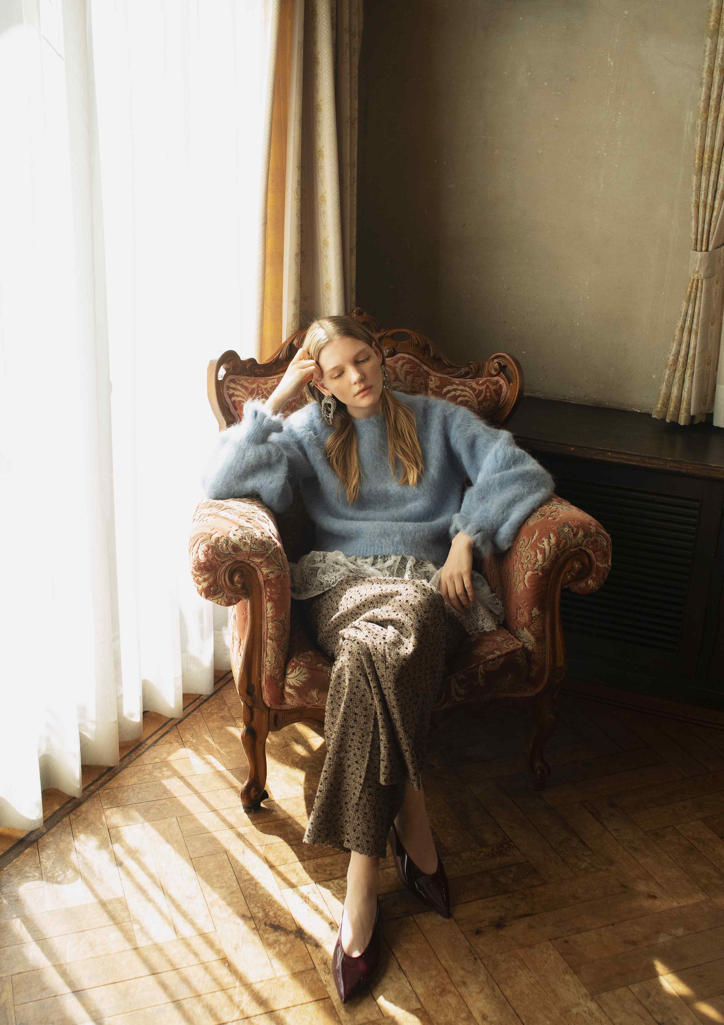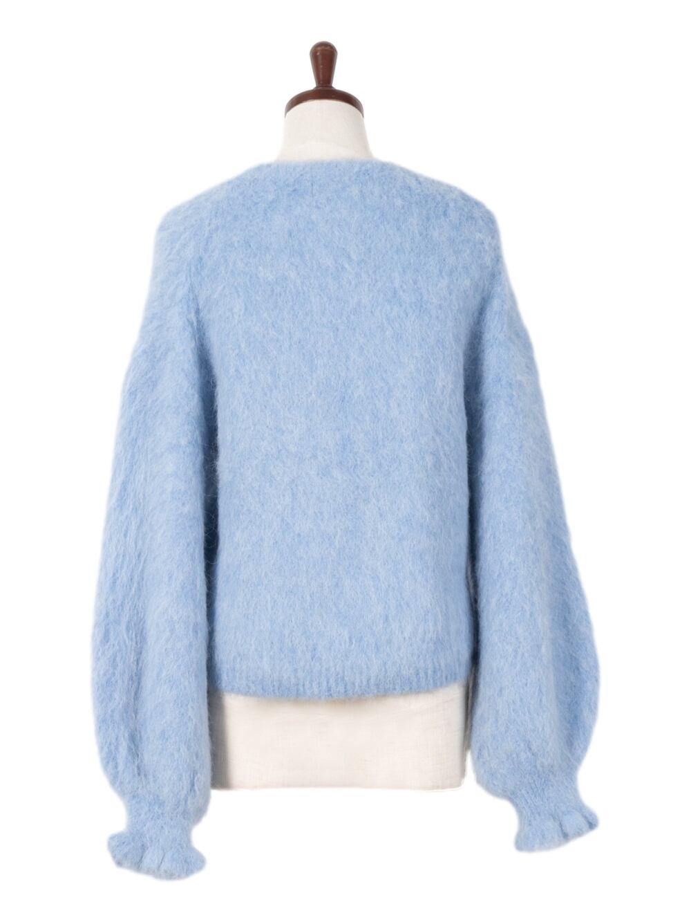 通気性、保温性、軽量感に優れているアルパカ糸を使用し、起毛加工を施しふわふわに仕上げ女性らしく優しい印象に仕上げました。