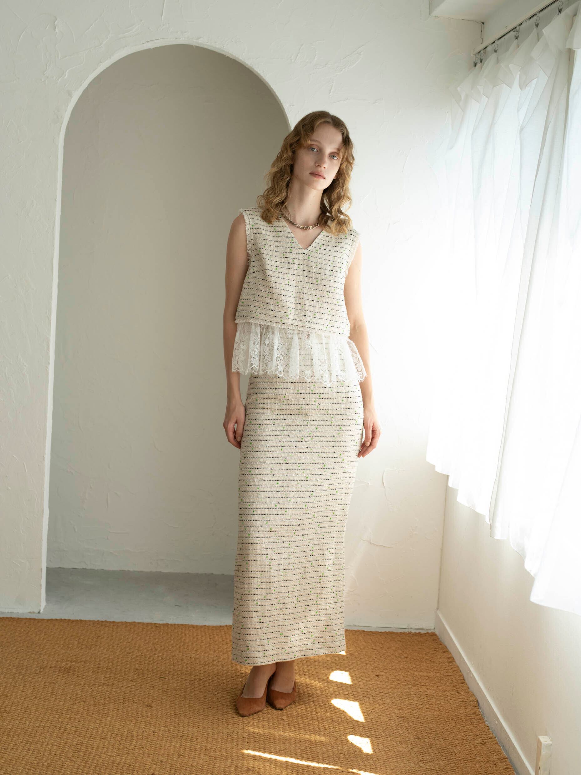 同素材のスカートと合わせてセットアップとして、同素材のポンポンツイードとの3ピースでのセットアップもおすすめです。きれいめな無地パンツとあわせてちょっとしたフォーマルシーンにも。カジュアルなデニムパンツスタイルでも◎。