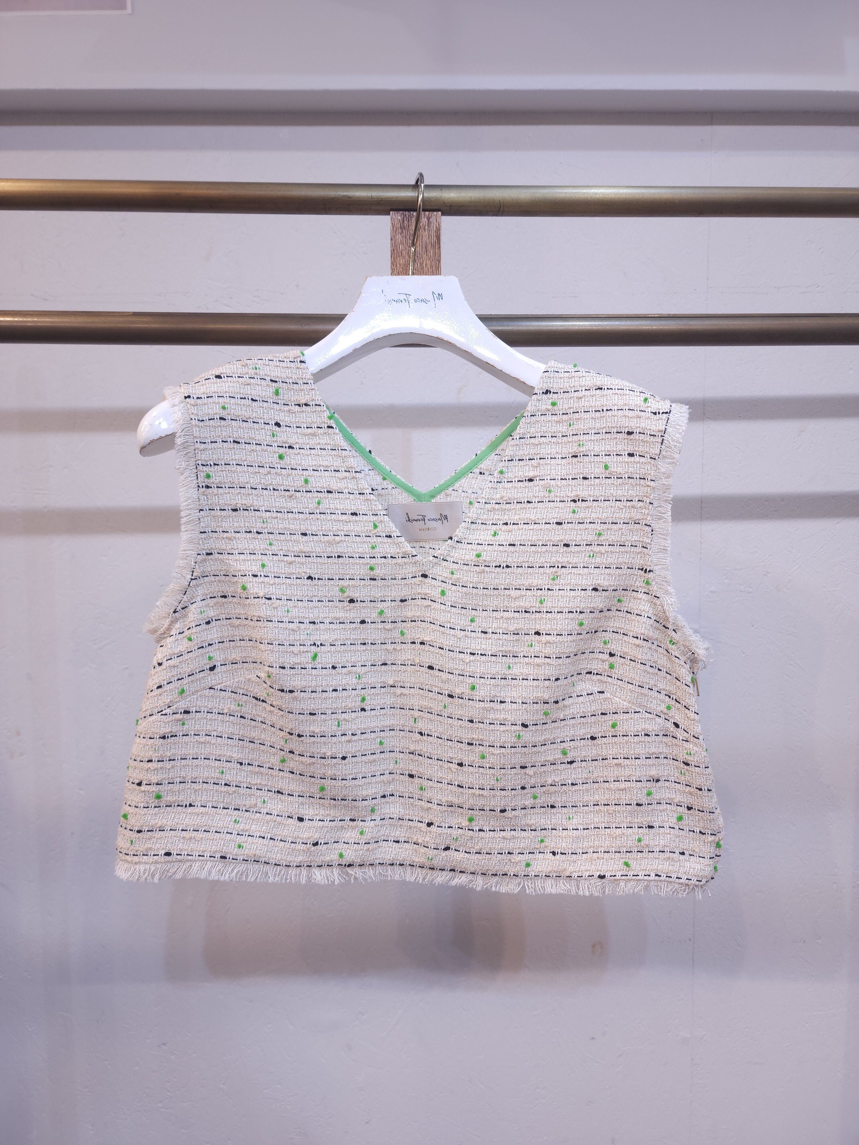 ◆人気のポンポンツイードの春バージョンの登場です。ベースにリネンを使用し、ポンポン糸やリング糸、スラブ糸などの様々な意匠糸織り上げたオリジナルツイード。