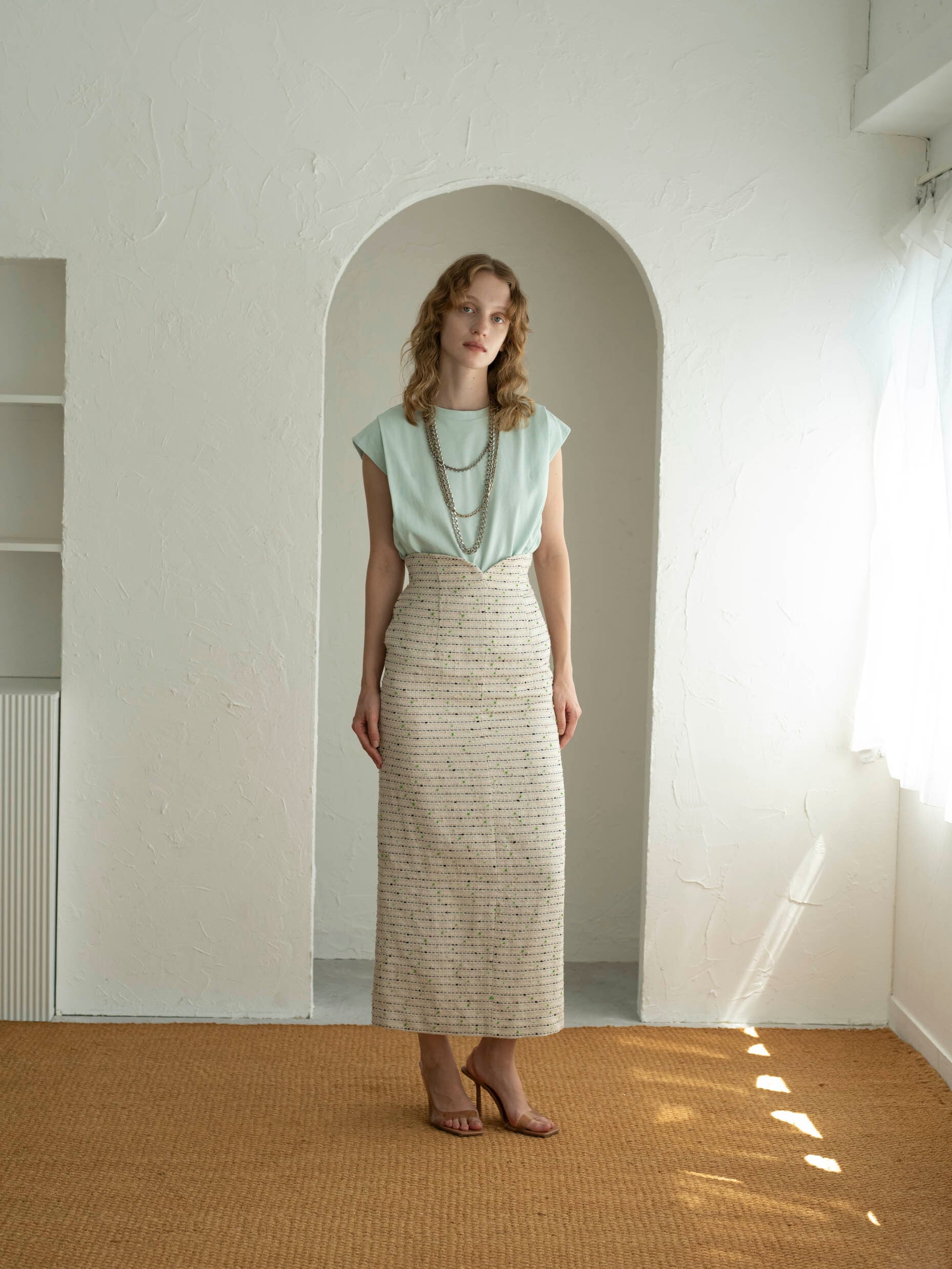 《柔らかな表情のツイードで、春の雰囲気を纏うスカート》