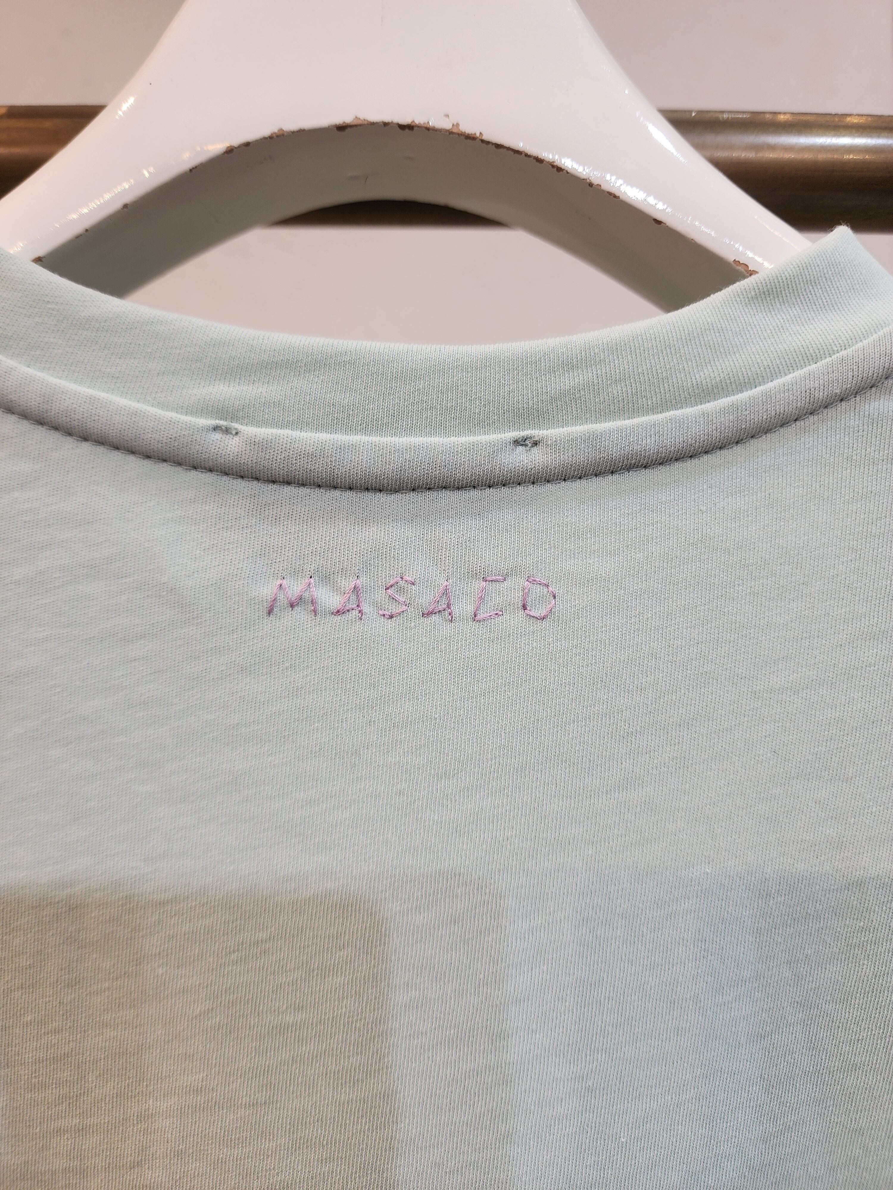 ハンド刺繍の様に仕上げたバックネックのMASACOロゴは香川県にて。撚糸を引き揃えてツイル目に編むことで生まれる立体感とシャリ感のある天竺に浅染をし、ヴィンテージ感を表現した素材に人気のタックTシャツに落とし込みました。