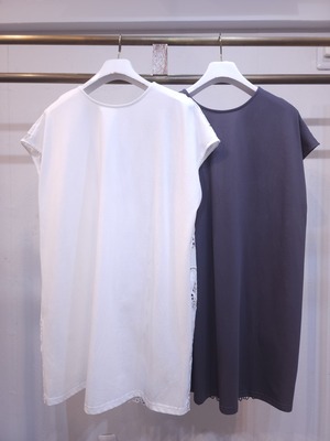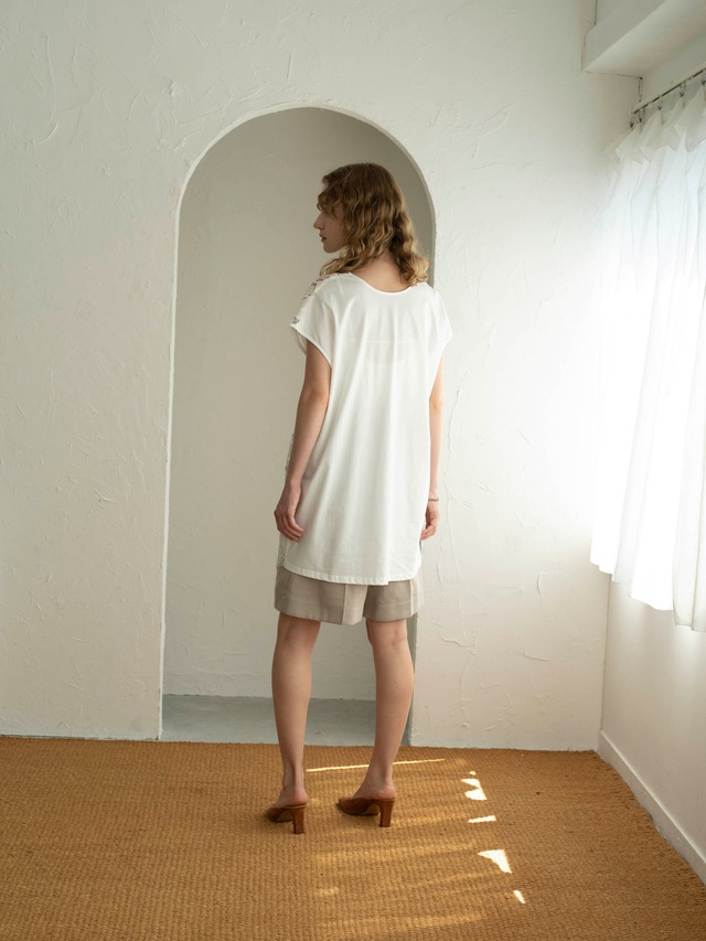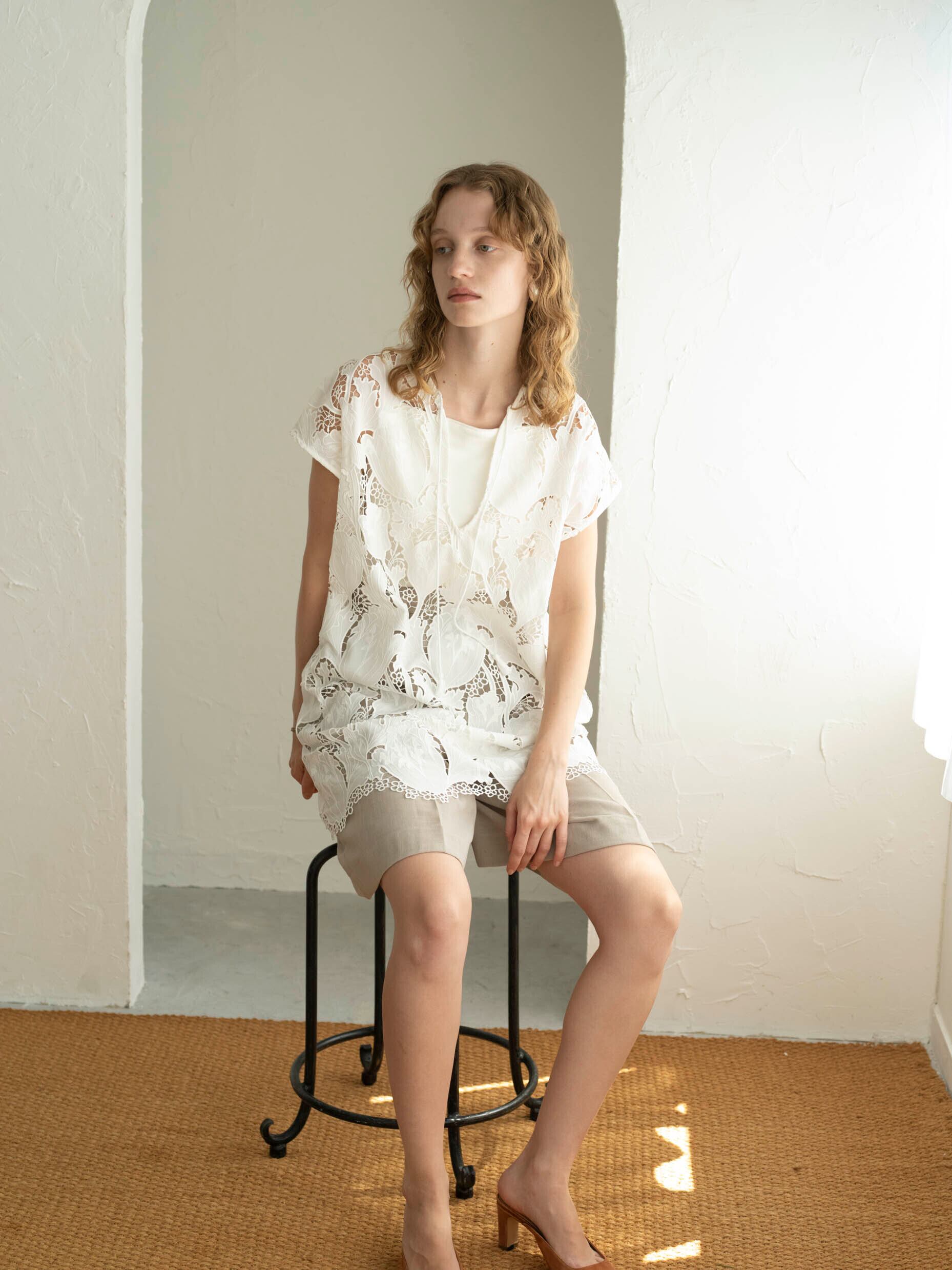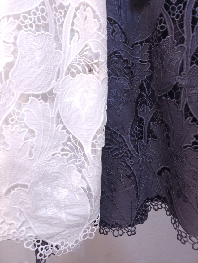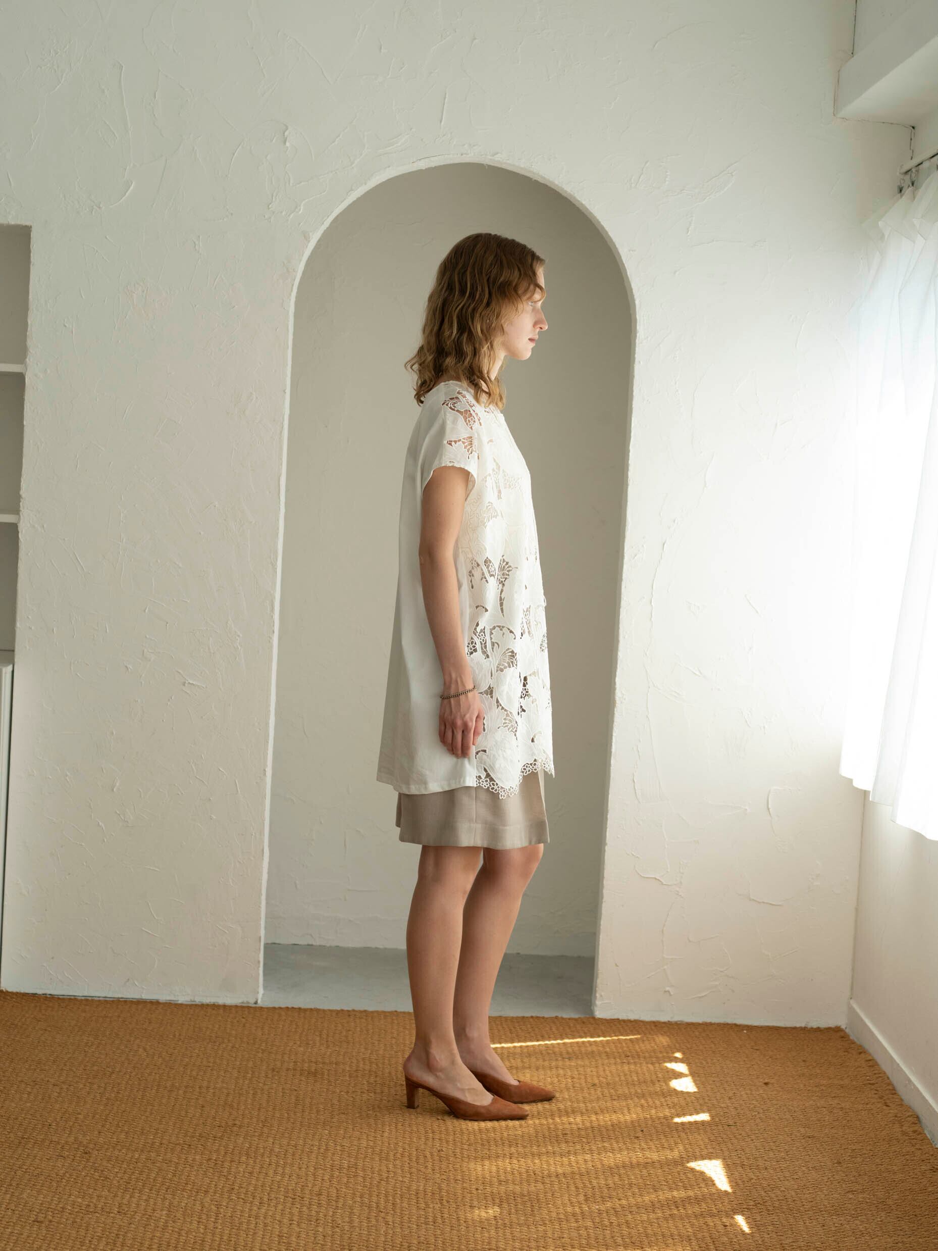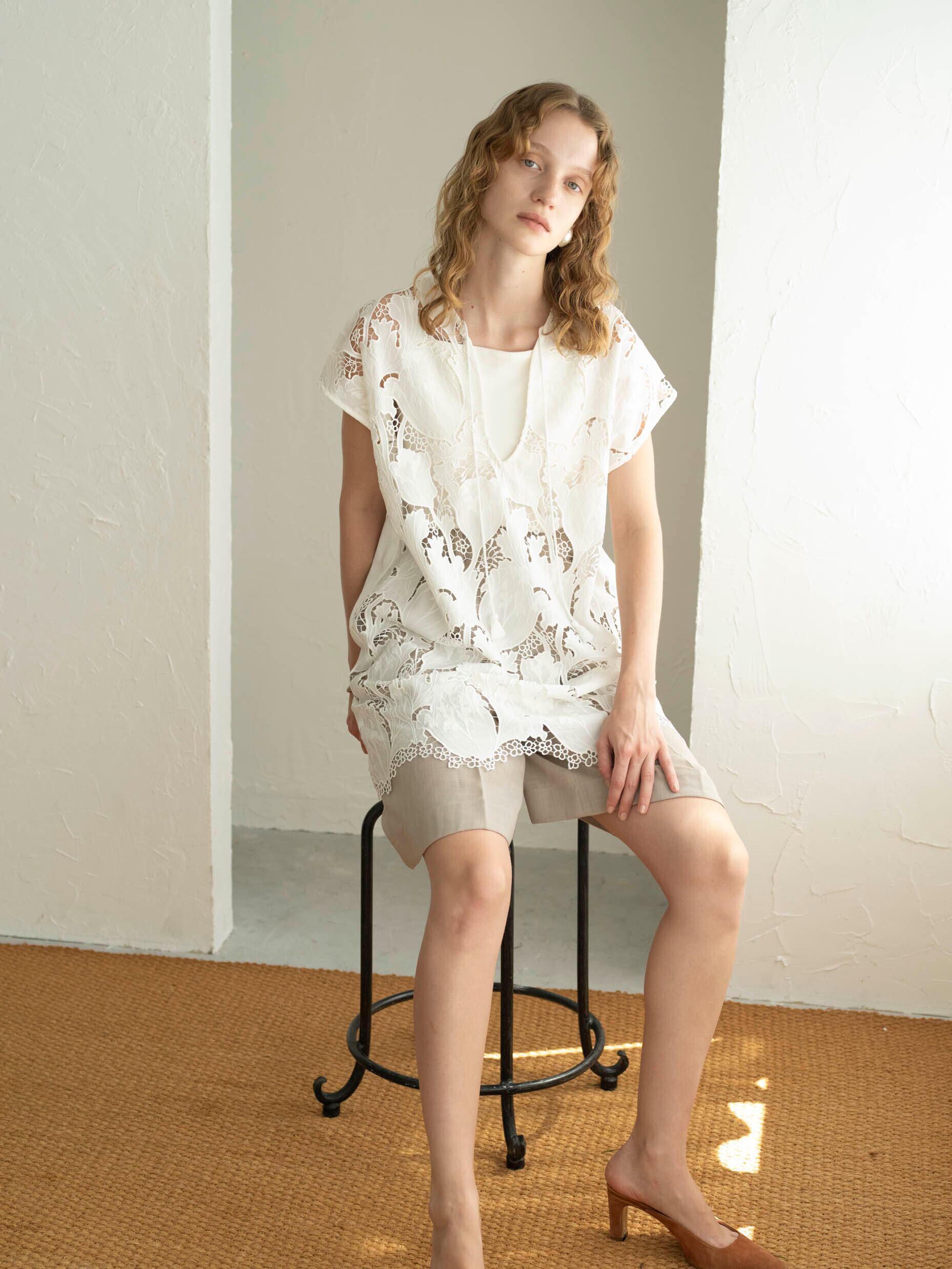 高度な技術を要するレーザーカット&ケミカル刺繍とカットソーをドッキングしたチュニックは前後2WAYで着用可能。