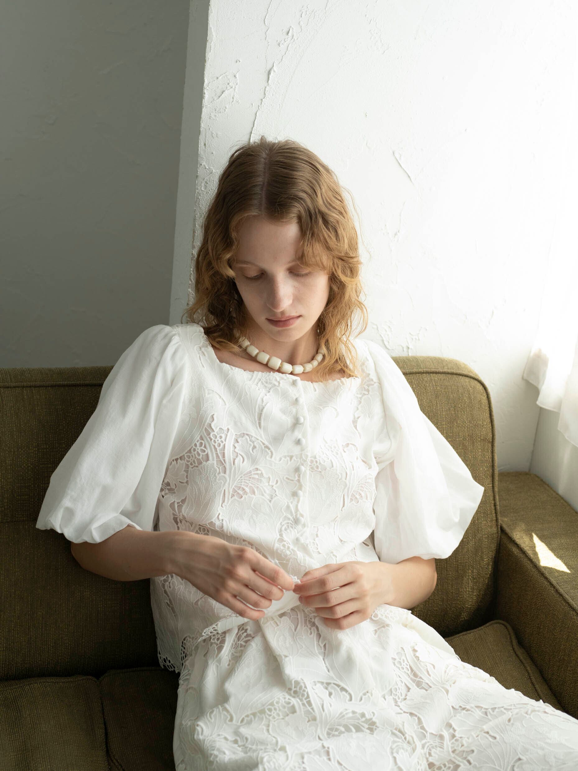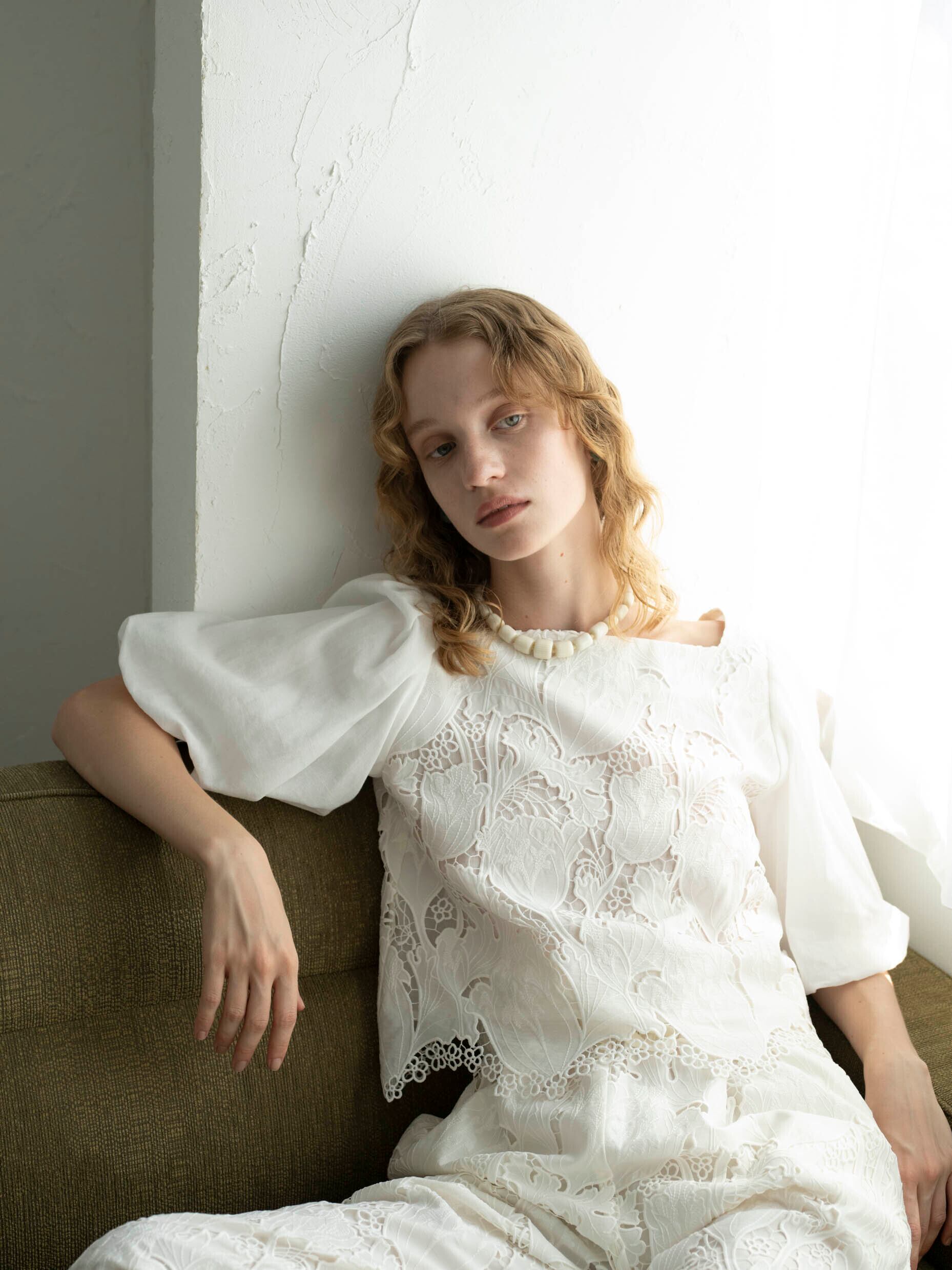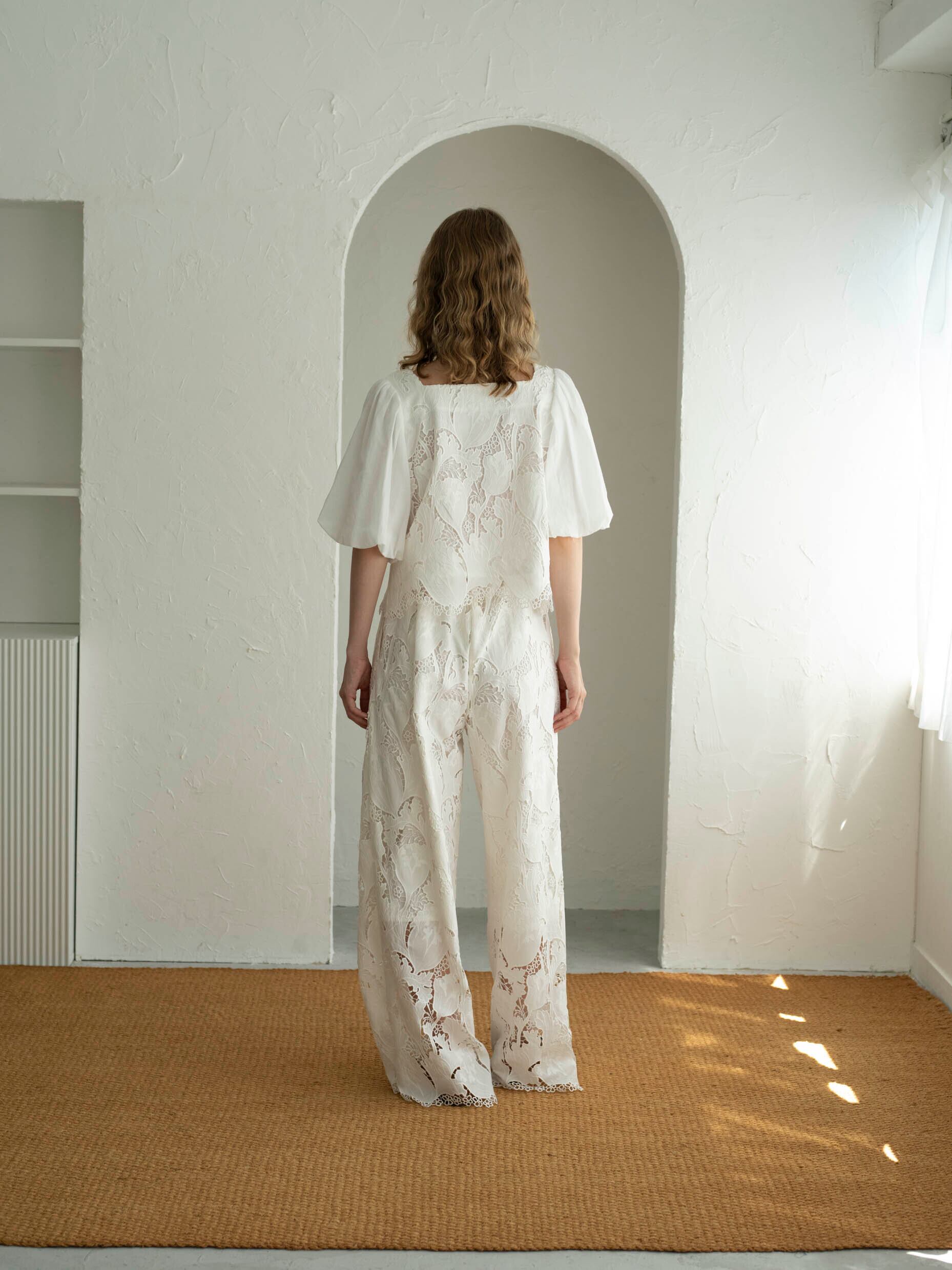 高度な技術を要するレーザーカット&ケミカル刺繍と綿シフォンをドッキングしたブラウスは前後2WAYで着用可能。