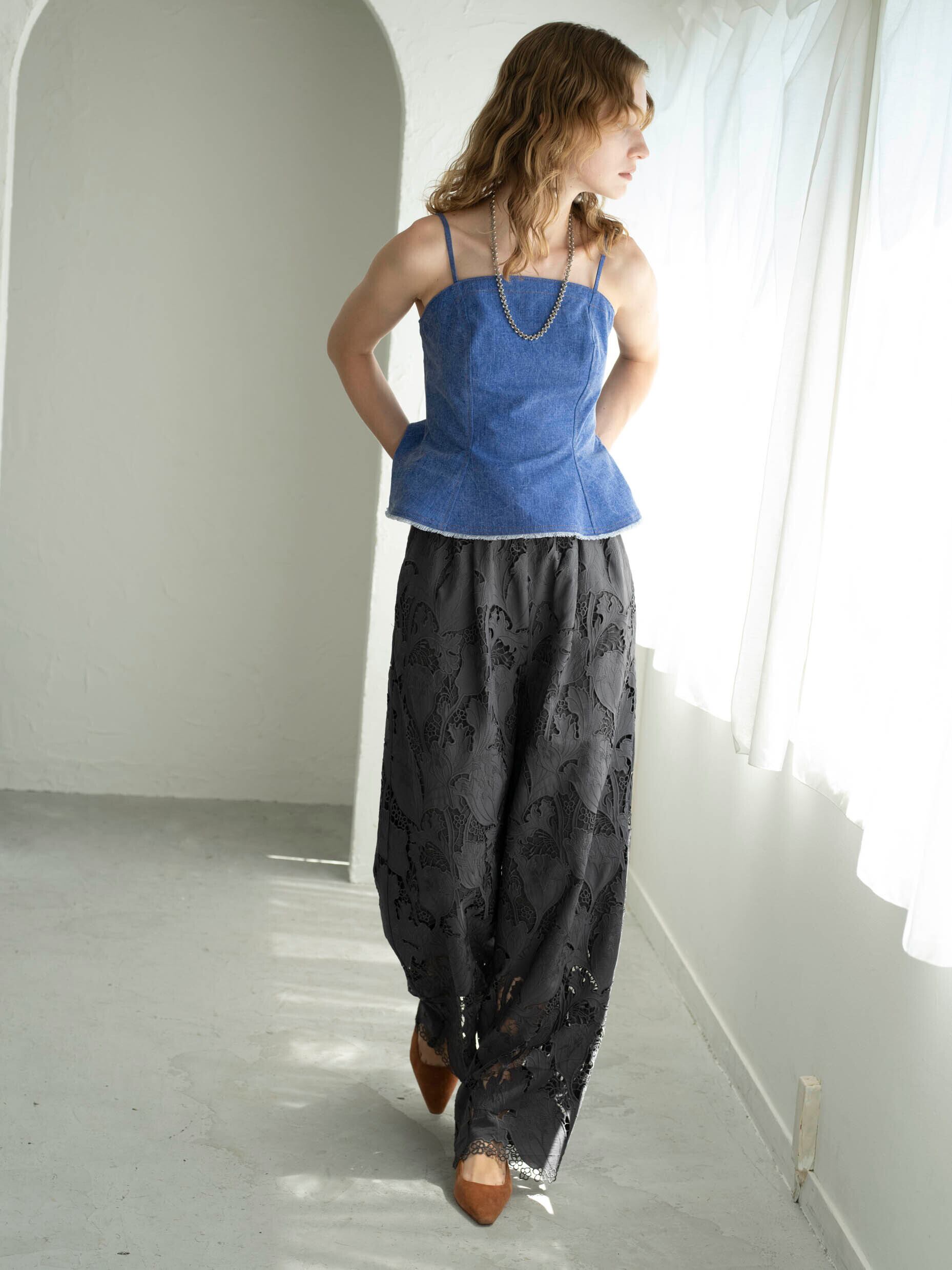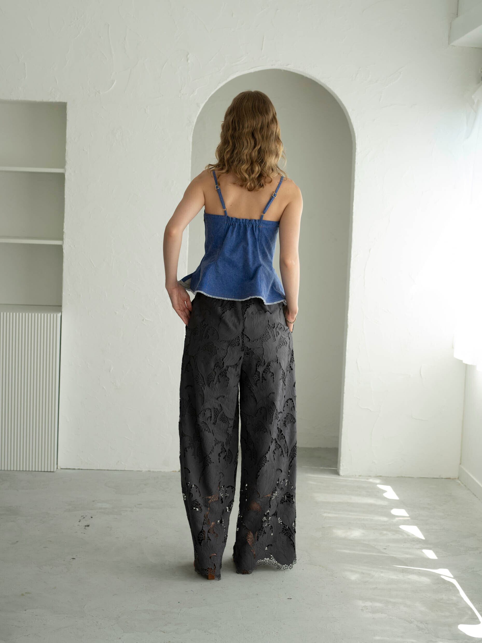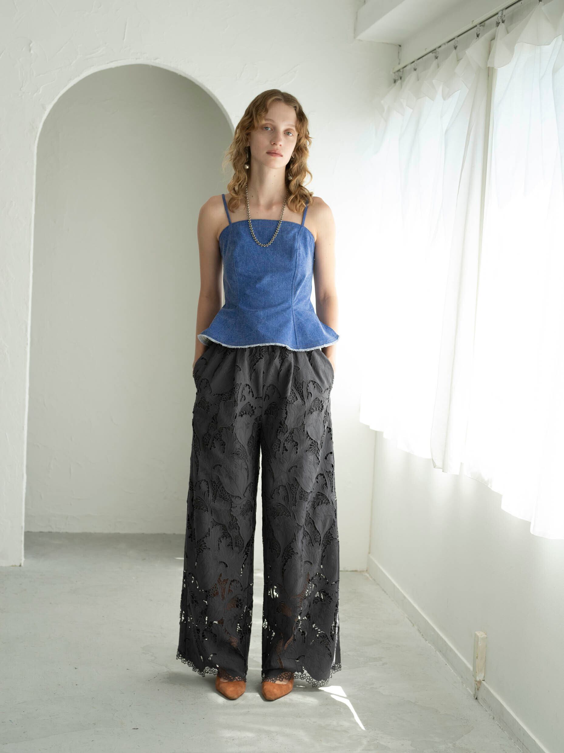 高度な技術を要するレーザーカット&ケミカル刺繍を贅沢に使用したワイドパンツ。