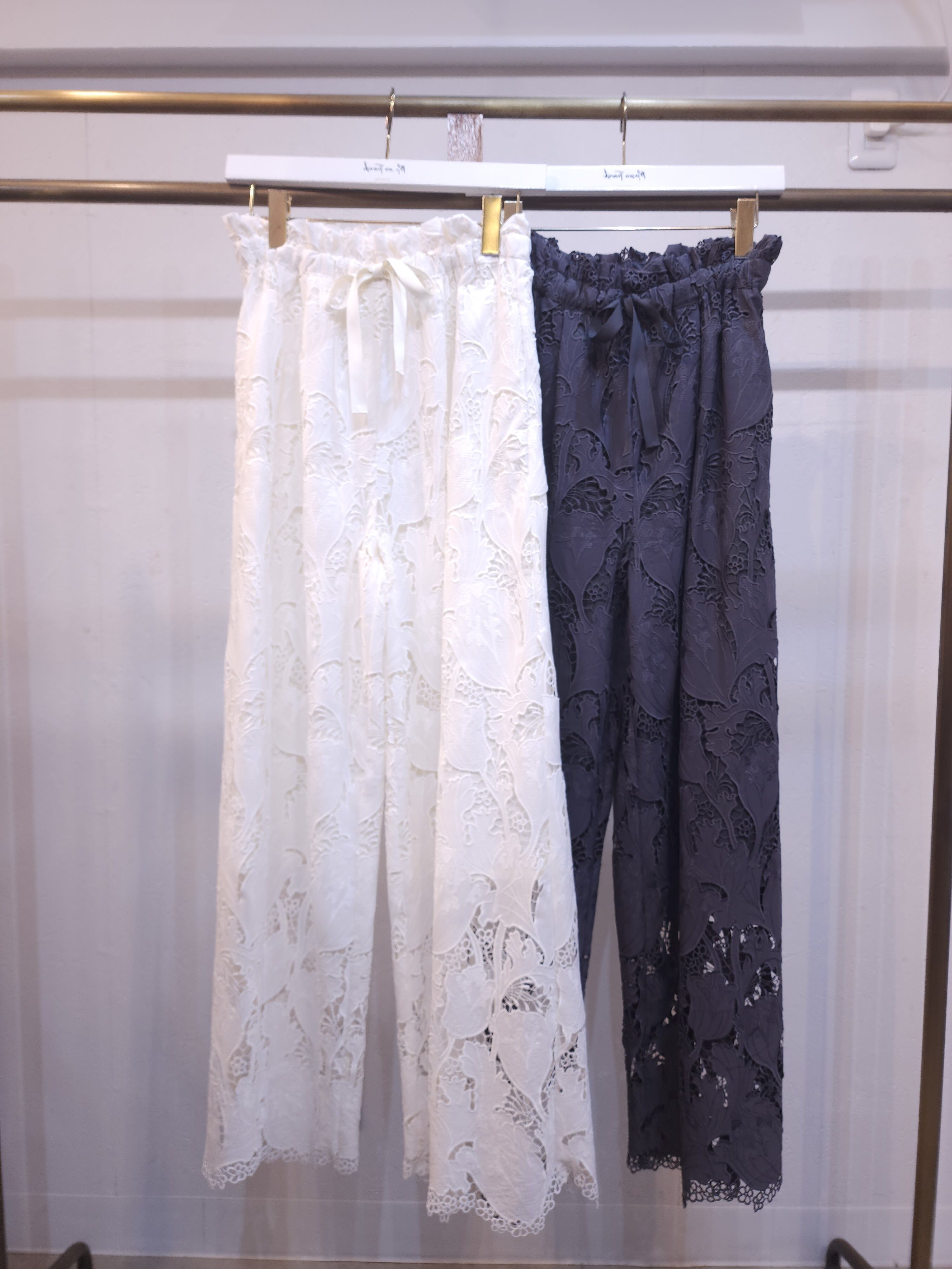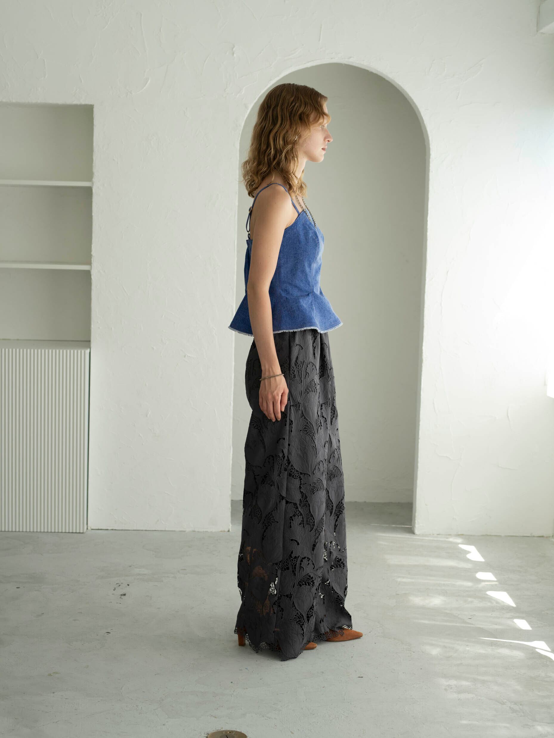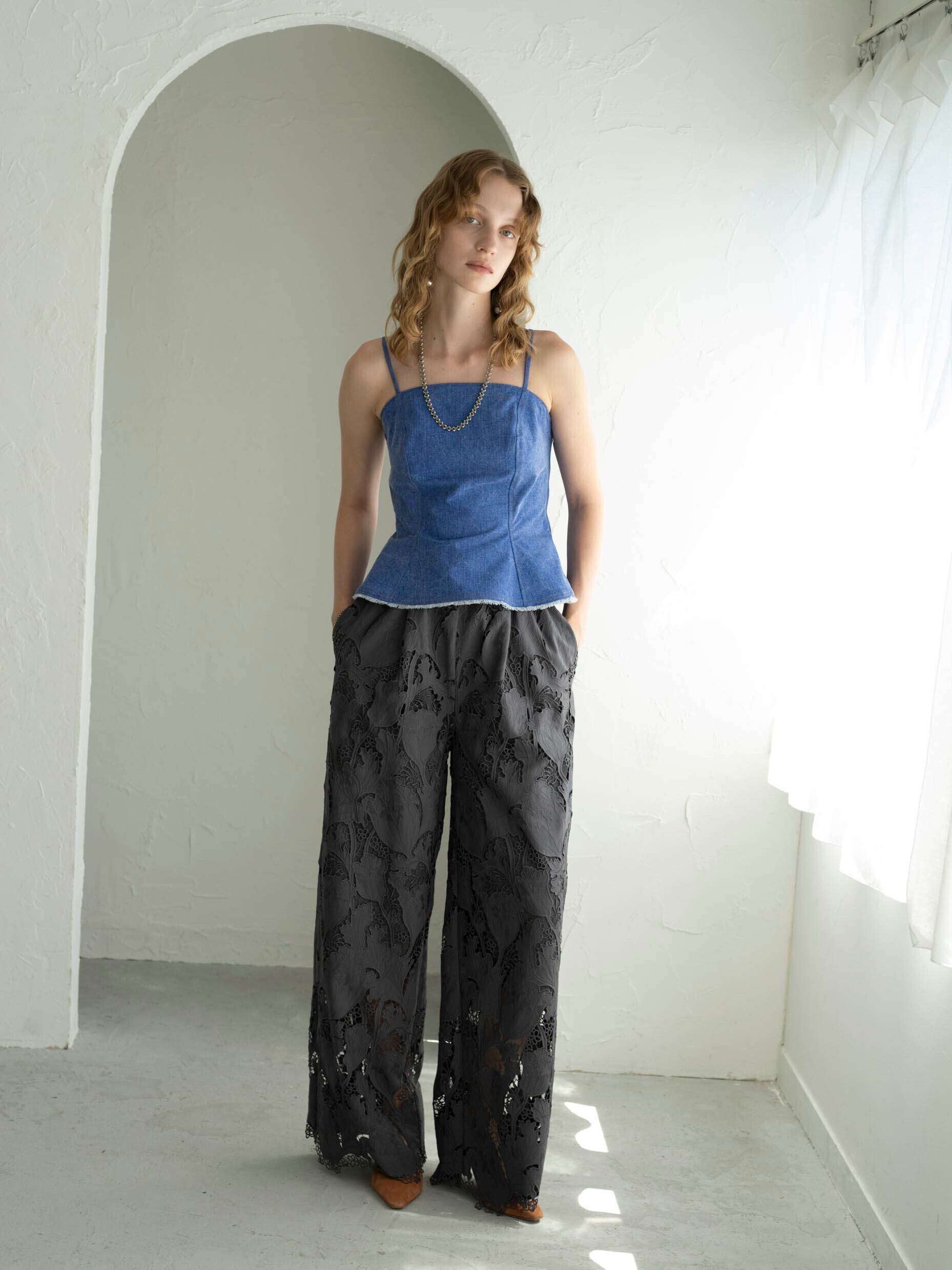 高度な技術を要するレーザーカット&ケミカル刺繍を贅沢に使用したワイドパンツ。