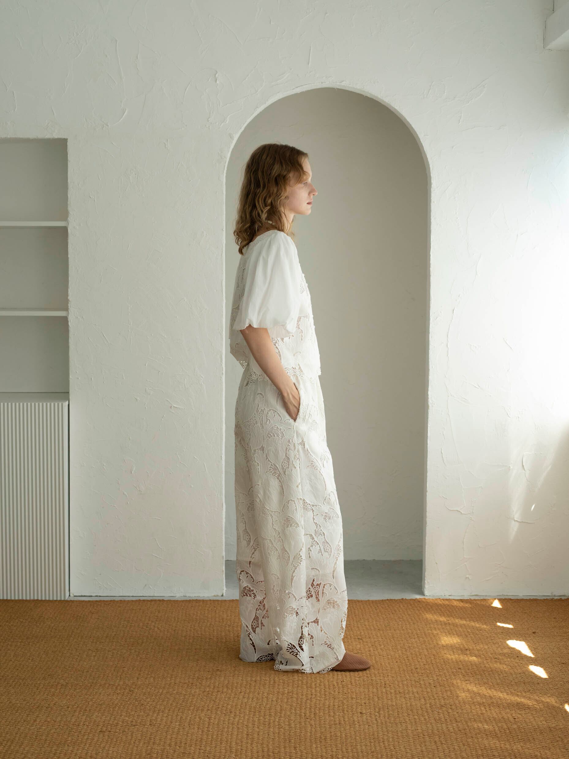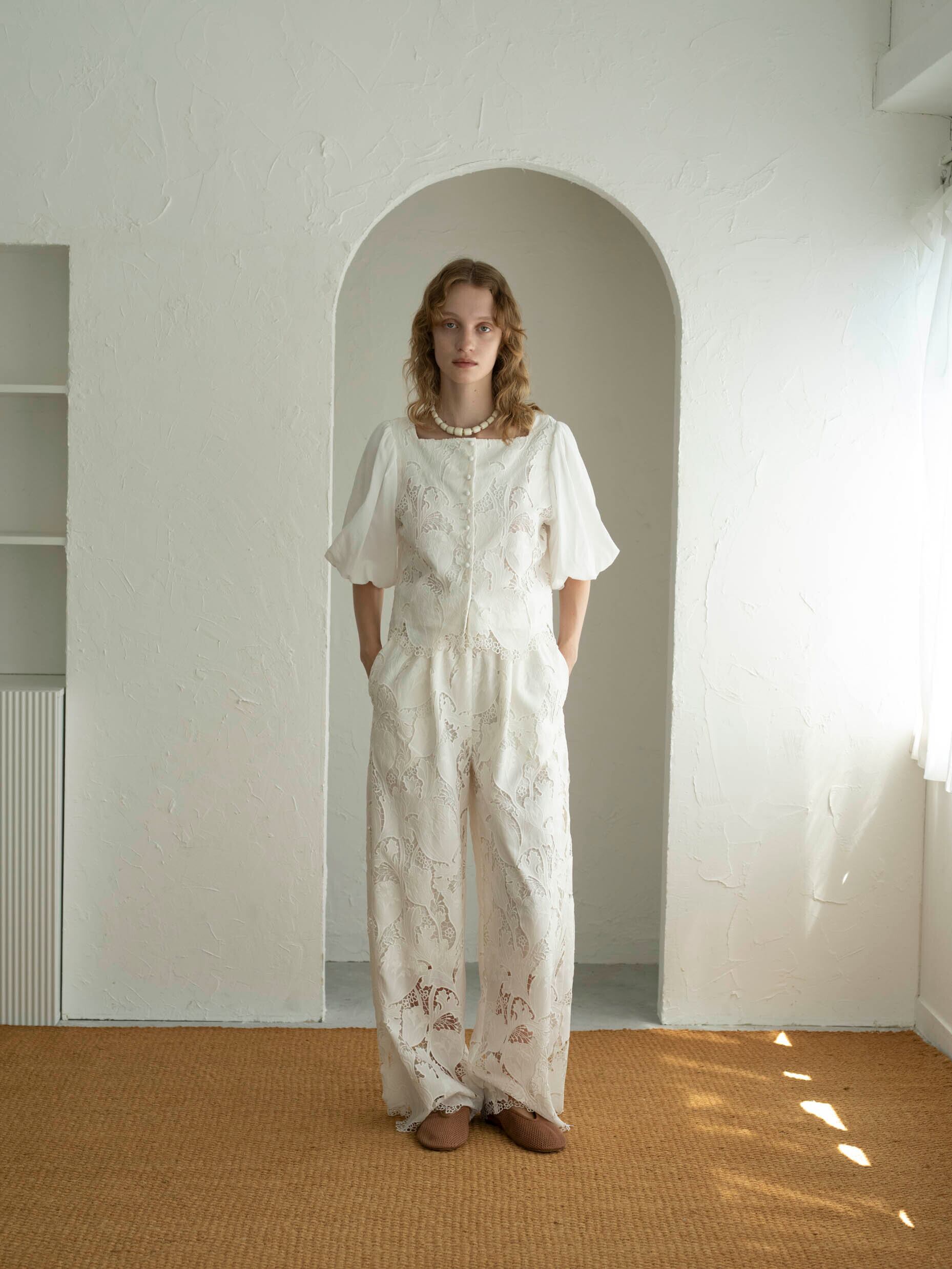高度な技術を要するレーザーカット&ケミカル刺繍を贅沢に使用したワイドパンツ。