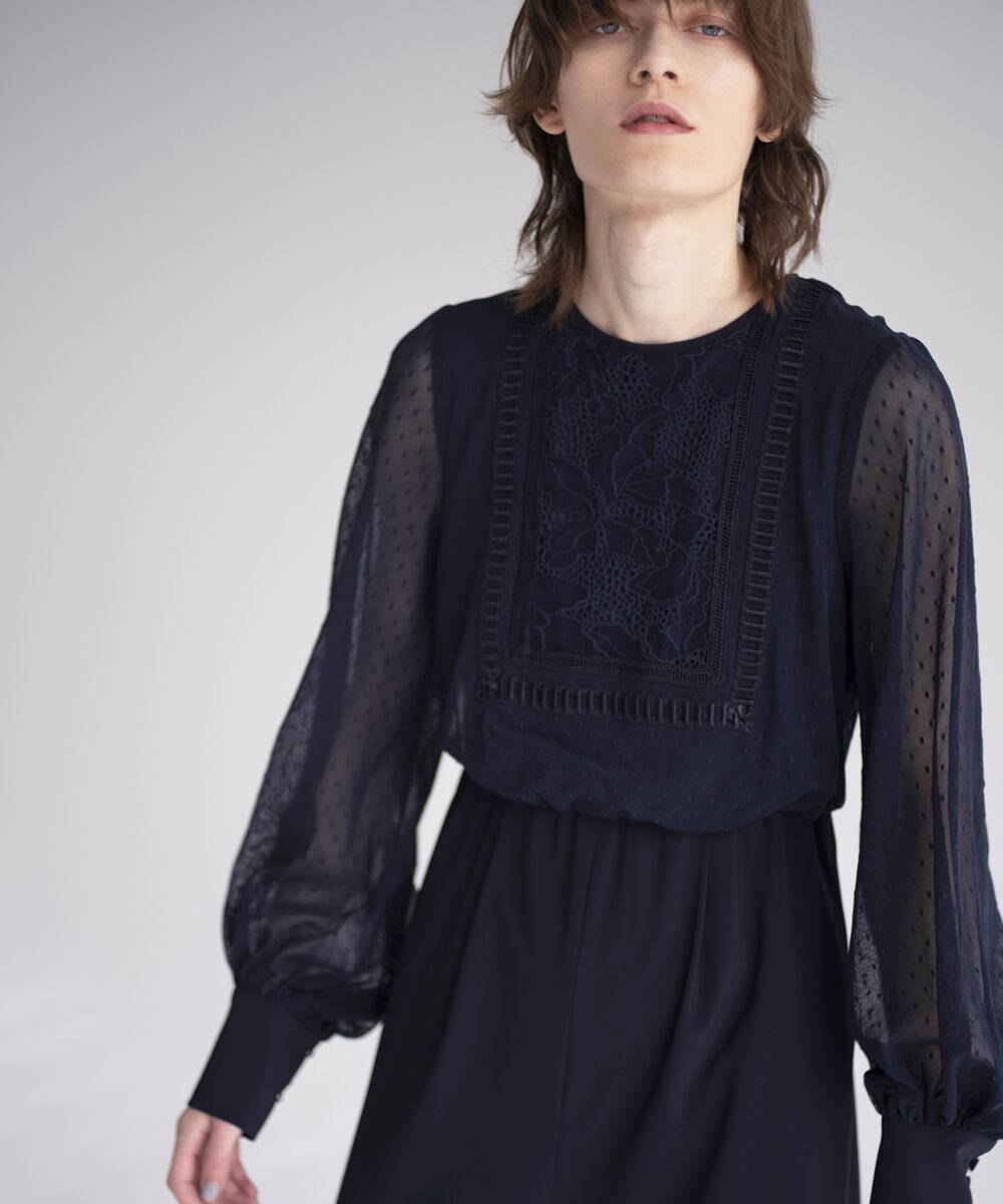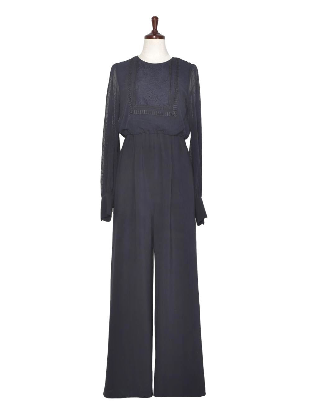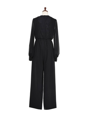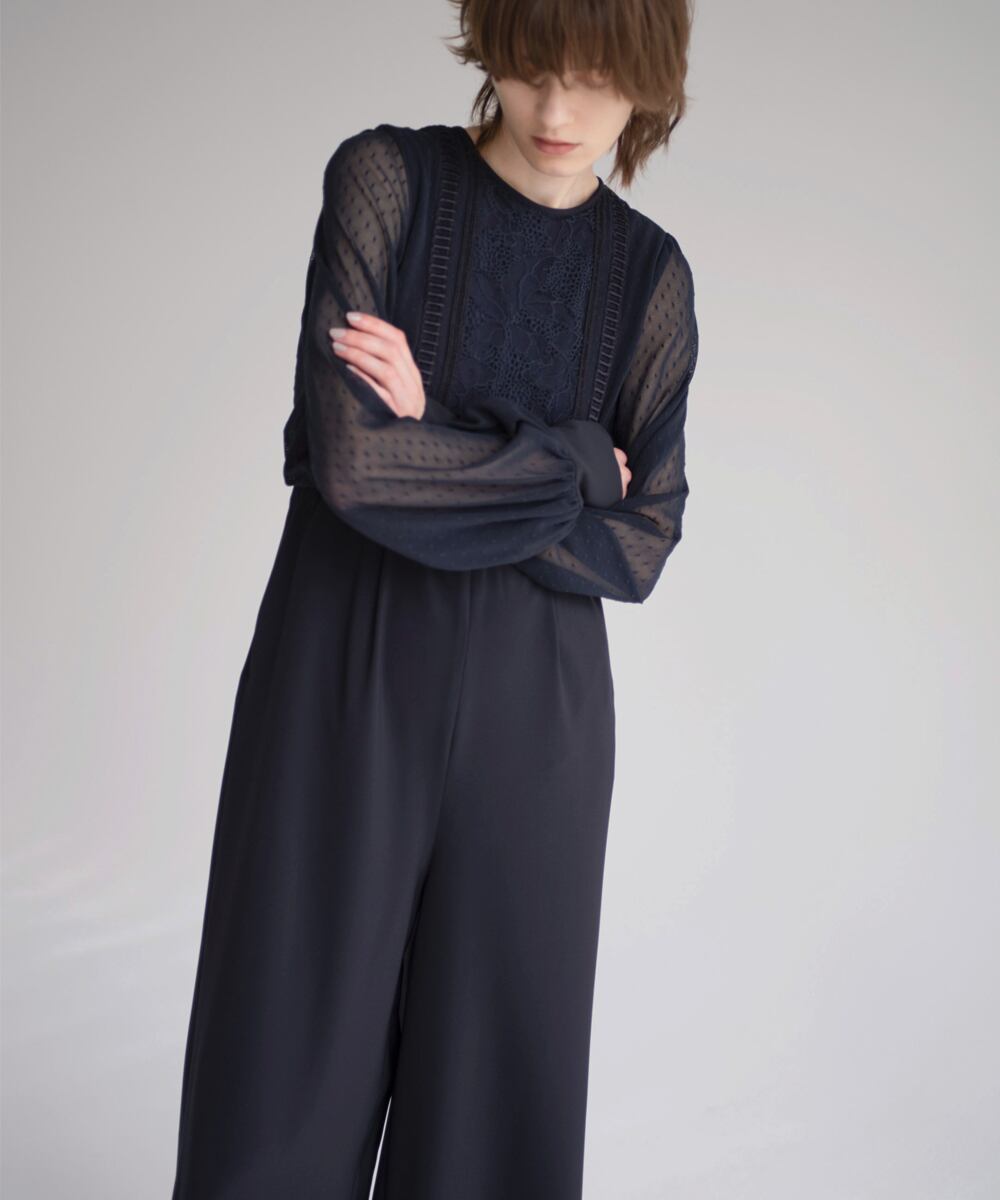 ドットチュールとラッセルレースのブロッキングにはしごレースディテールがポイントのオールインワン。ウエストはゴム仕様で楽にご着用頂けます。