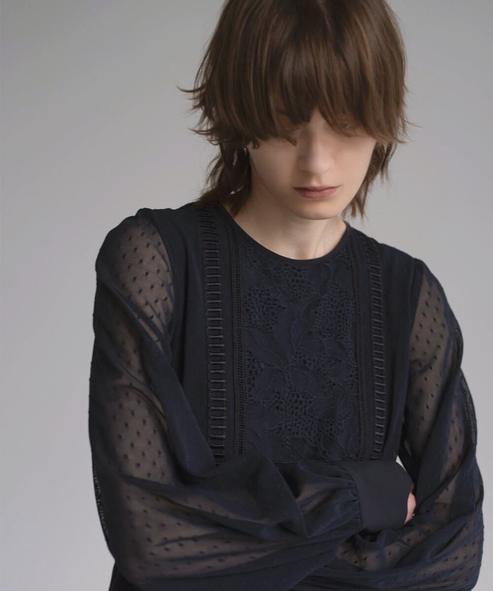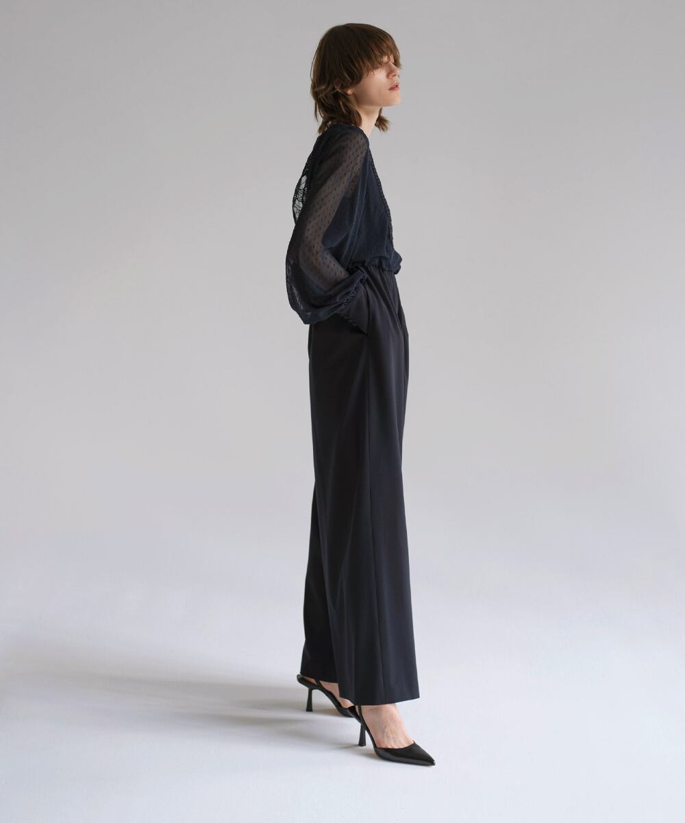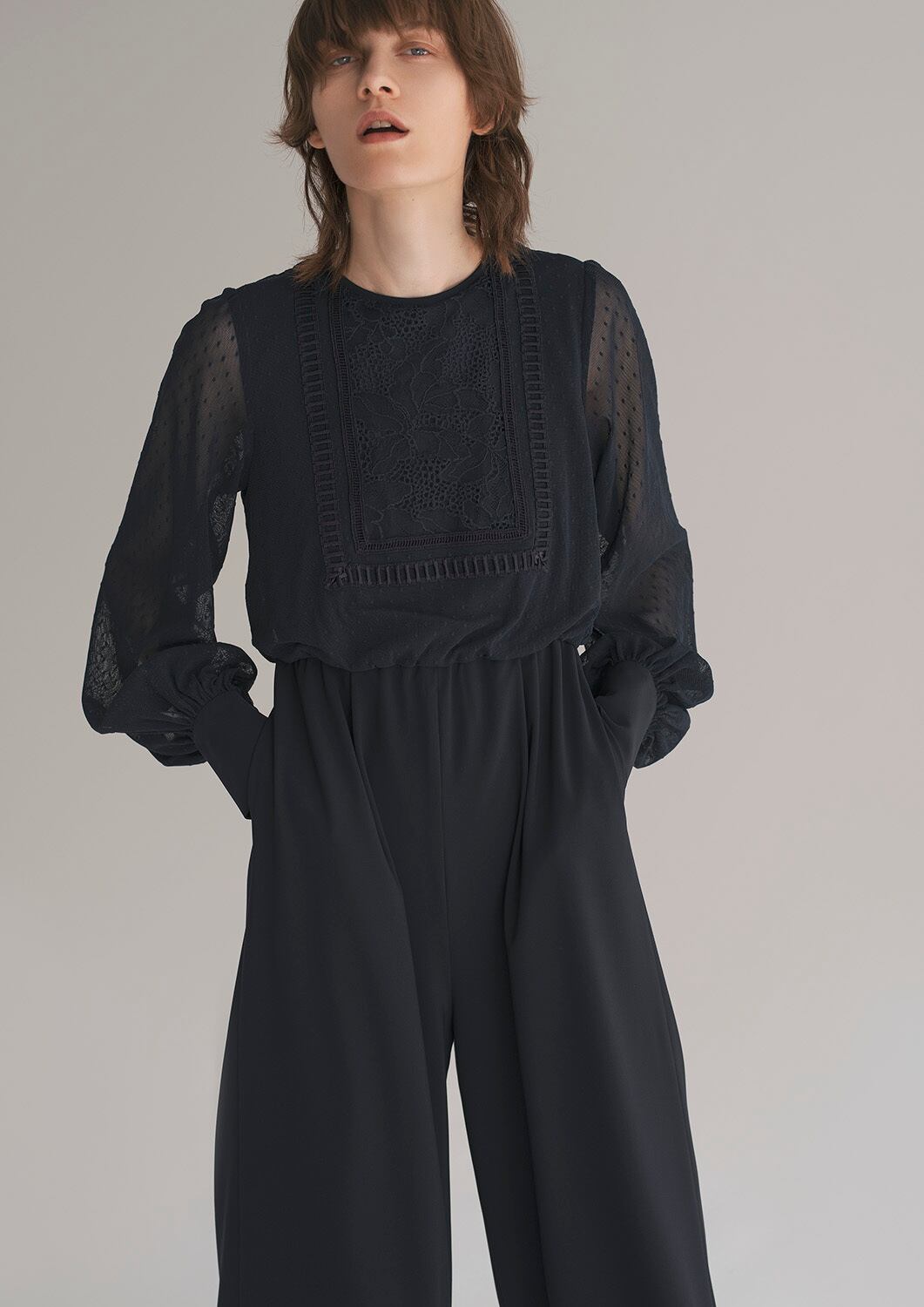 ドットチュールとラッセルレースのブロッキングにはしごレースディテールがポイントのオールインワン。ウエストはゴム仕様で楽にご着用頂けます。